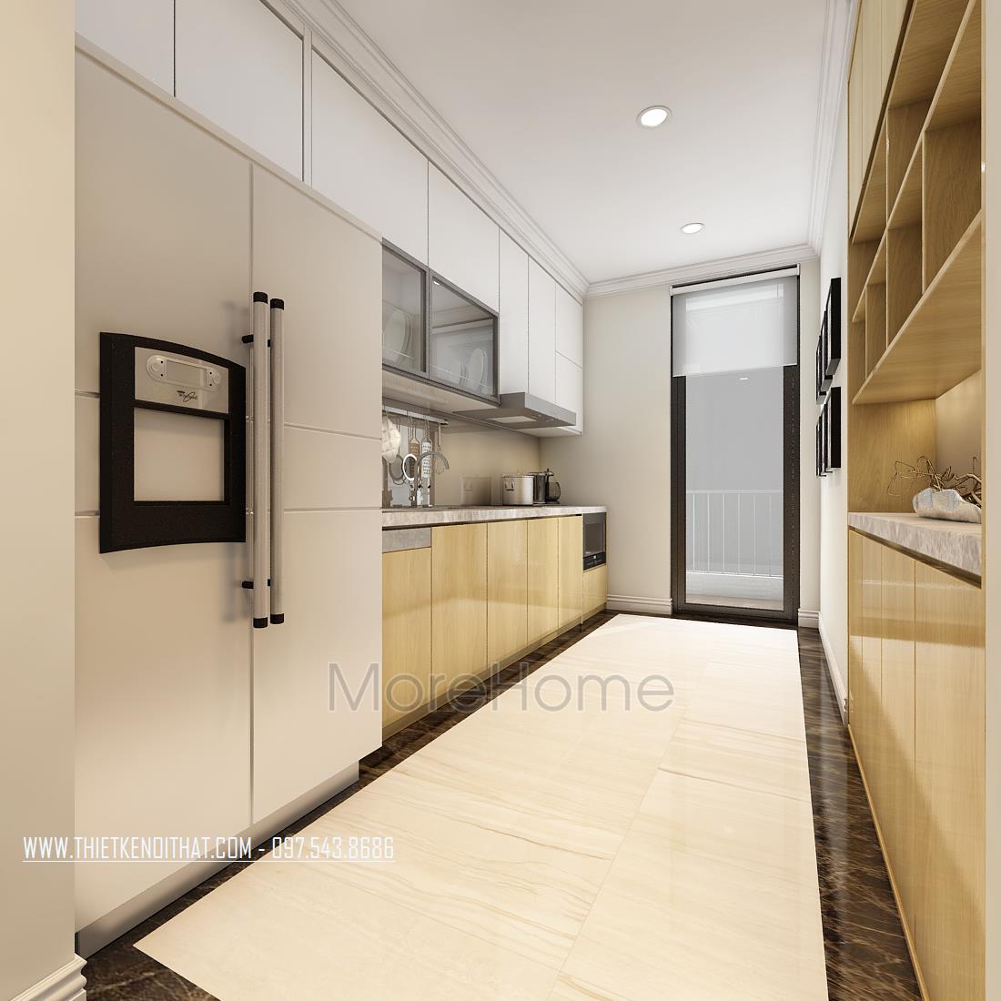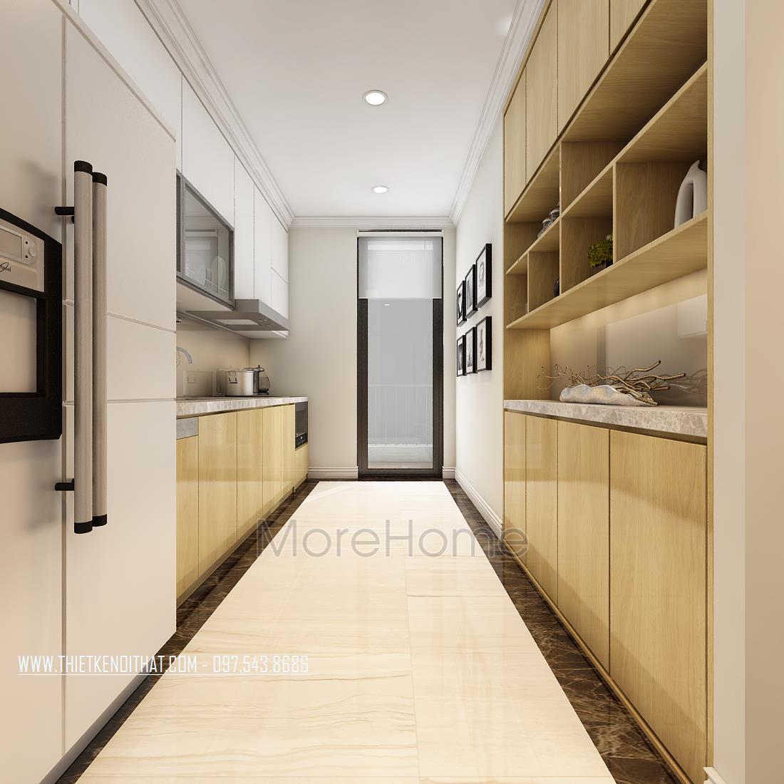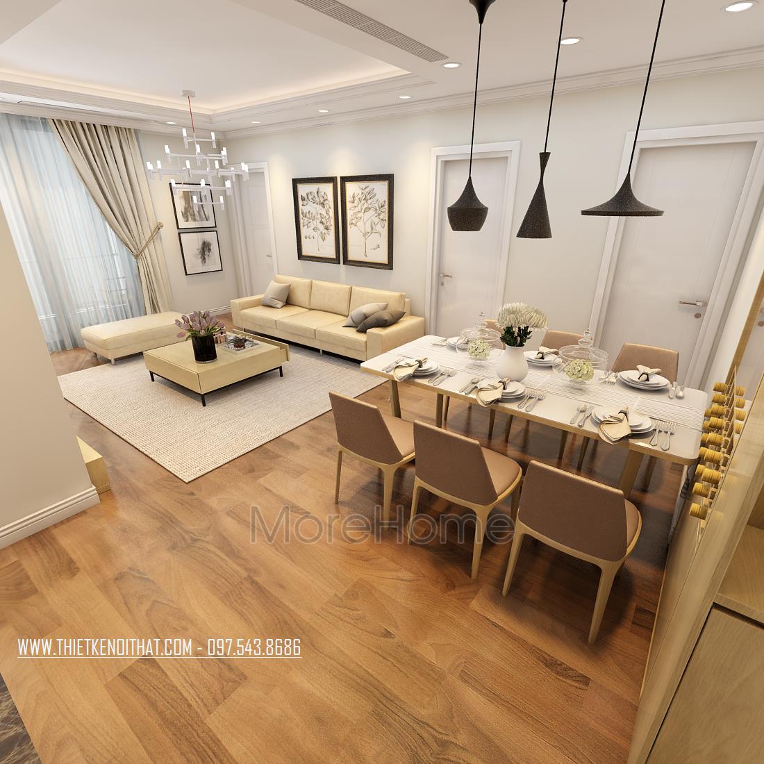 Tiếp theo là thiết kế nội thất không gian bàn ăn hiện đại. Không gian thiết kế được sắp xếp khá giản đơn với bộ bàn ghế nhỏ, không hề nhấn mạnh vào các chi tiết trang trí những thiết kế khá ấn tượng nhờ vào tính công năng. Thiết kế tủ gỗ kính trong suốt đa ngăn vừa đảm bảo tính công năng lại giúp không gian trở nên ấn tượng hơn, tạo điểm nhấn trong thiết kế. Ngoài ra, các chi tiết trang trí nhẹ nhàng như đèn chiếu sáng, tranh treo tường sáng tạo giúp không gian trở nên ấn tượng và thu hút hơn rất nhiều. Bàn ăn được đặt gọn gàng, thiết kế linh hoạt, dễ dàng biến thu gọn, mở ra không gian đa năng giúp tăng mục đích sử dụng cho không gian chung cư hẹp.