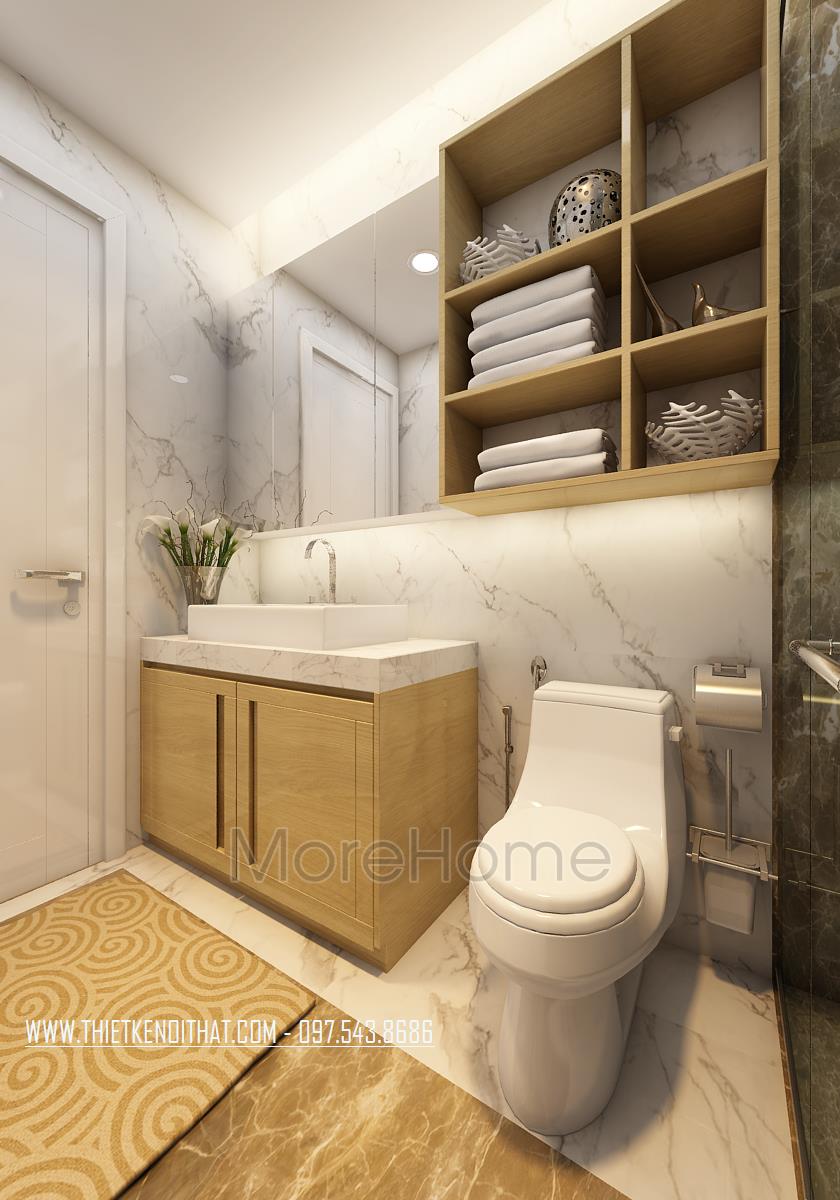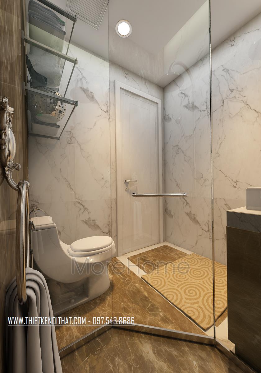 Cuối cùng là không gian thiết kế nội thất phòng tắm hiện đại. Thiết kế khá thu hút bởi kiến trúc sư đã sử dụng các vật liệu mát như đá tự nhiên và kính cường lực. Các vật liệu này là mấu chốt giúp mang lại một không gian thoáng và thư giãn cho căn phòng hẹp này. Độ phản chiếu nhẹ nhàng từ kính và gương giúp mang lại cảm giác cơi nới cho căn phòng, xóa tan sự bí bách, khó chịu.