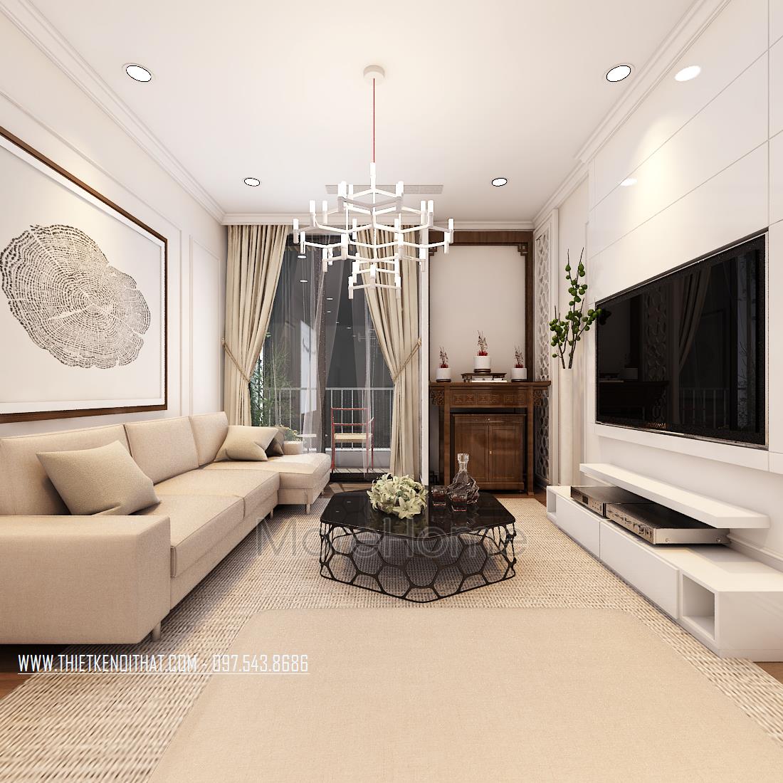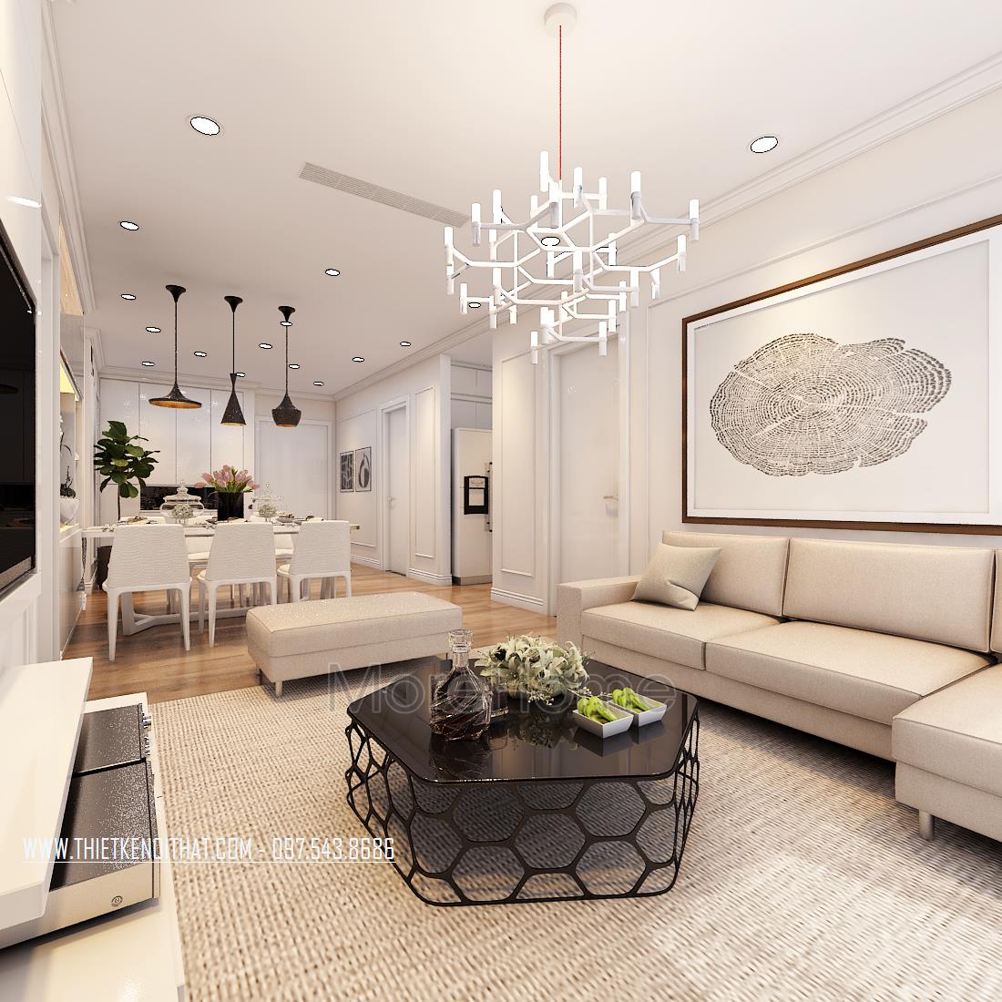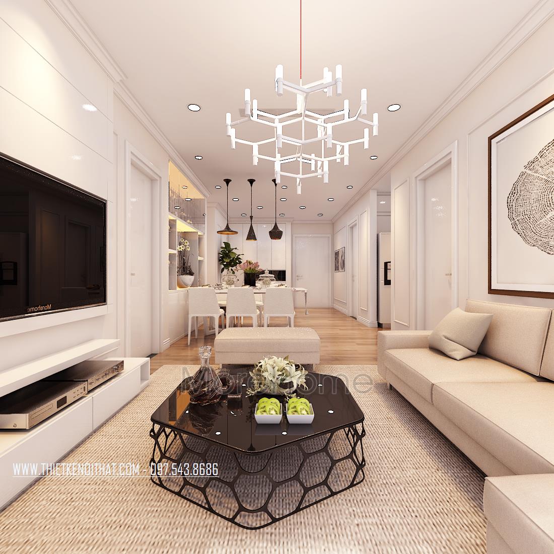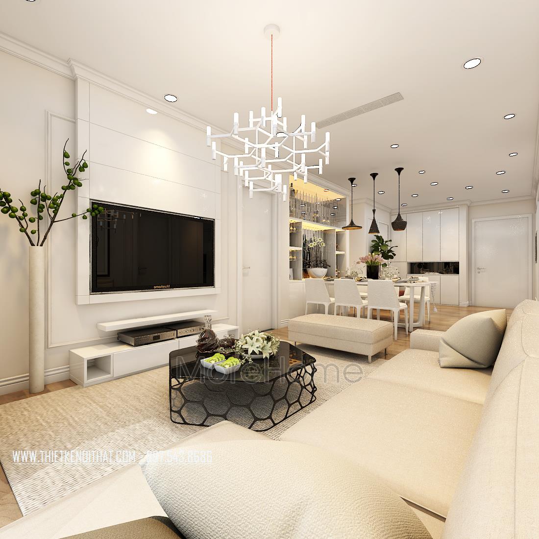 Thiết kế nội thất phòng khách phong cách hiện đại là một trong những thiết kế mở ấn tượng và đầy thu hút. Sắc trắng từ các vật dụng mang đến cho gia chủ cảm giác thoải mái, dễ chịu và vô cùng tinh tế. Bộ sofa được lựa chọn có kiểu dáng khá đơn giản, không cầu kỳ, nhấn mạnh vào chi tiết trang trí nên không hề tạo cảm giác rối và gò bó cho không gian. Ở thiết kế nội thất phòng khách căn chung cư Park Hill này còn khéo léo sử dụng các vật dụng thiết kế sáng tạo như bàn đặt phòng khách, hay đèn chùm giúp không gian trở nên mới lạ và ấn tượng hơn. Ti vi được đặt âm tường theo dụng ý của kiến trúc sư, giúp không gian được gọn gàng hơn nhiều.