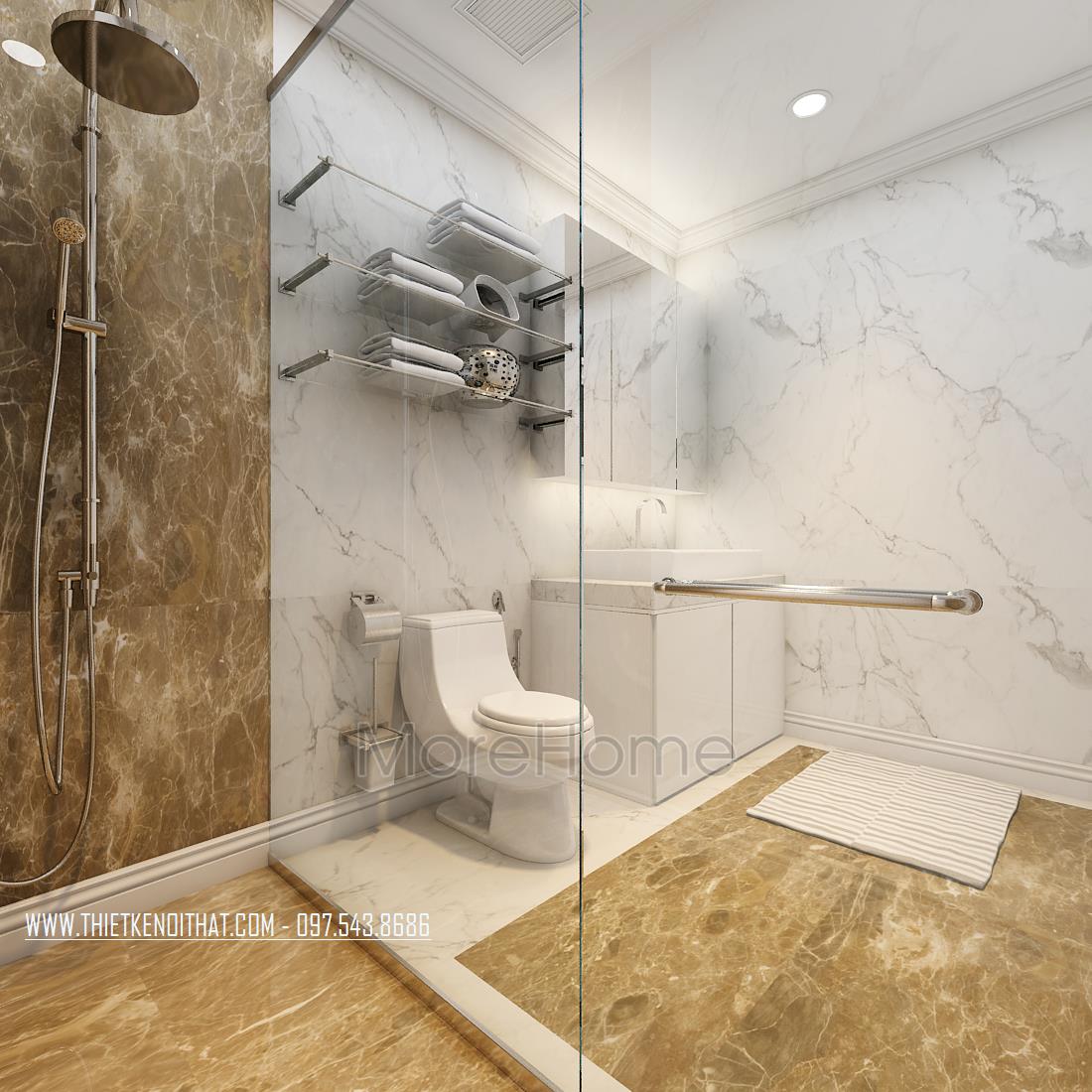 Cuối cùng là thiết kế nội thất phòng tắm hiện đại. Các vật liệu nhẹ như gương, kính cường lực trong suốt là các vật liệu được sử dụng nhiều nhất giúp tạo sự liền mạch và tăng độ mở cho không gian. Đá tự nhiên ốp tường hoa văn đơn giản, vừa đảm bảo tính thẩm mỹ lại dễ dàng lau chùi.