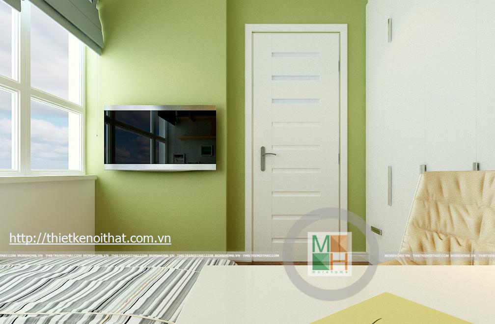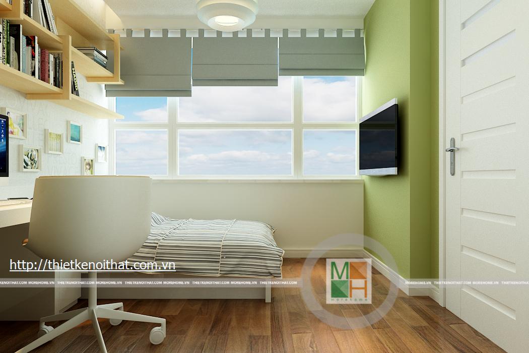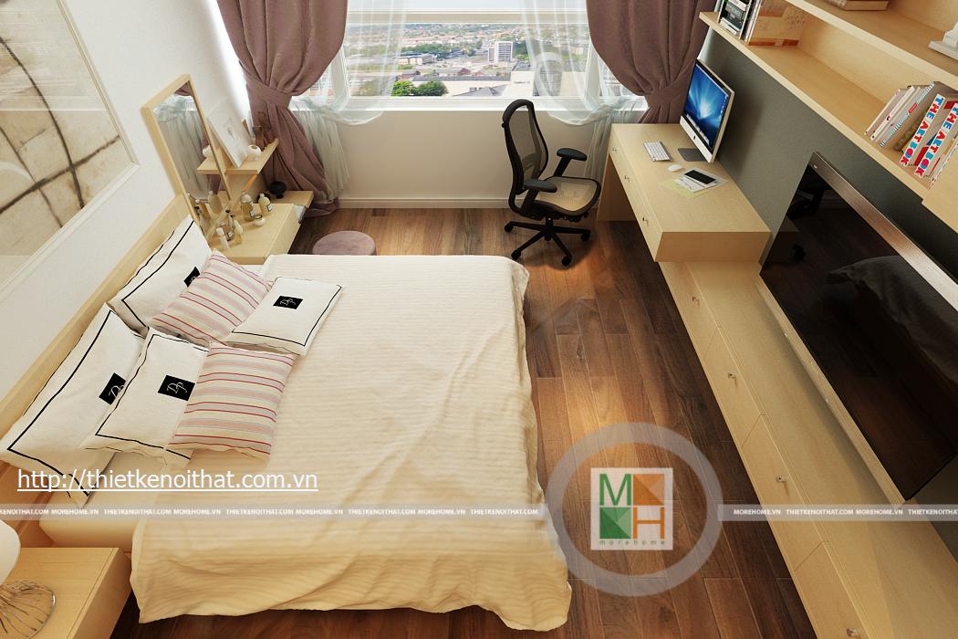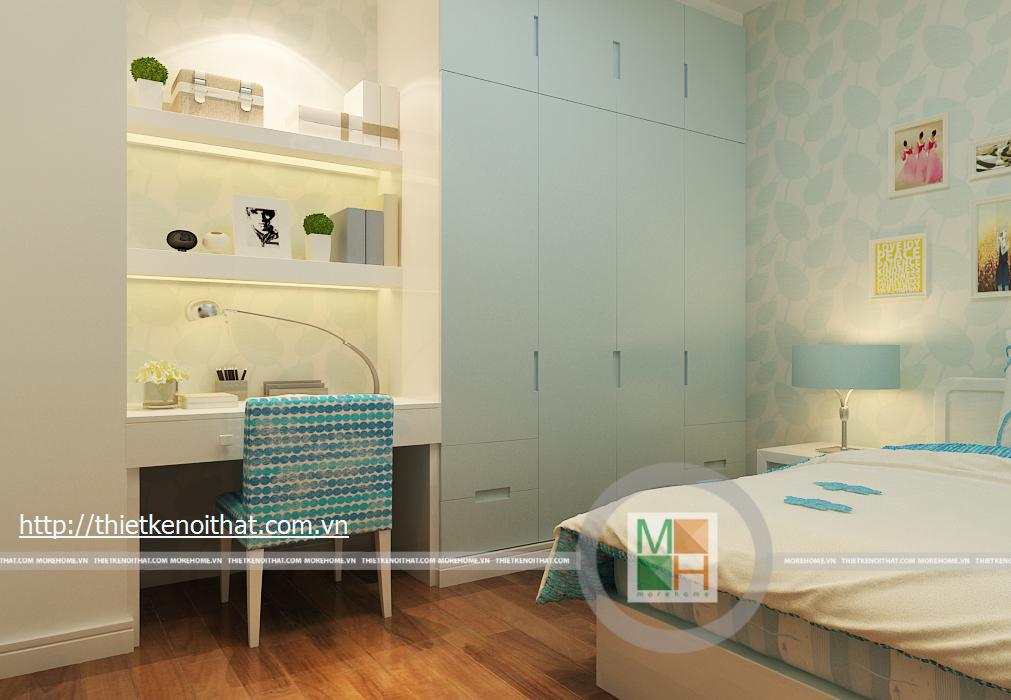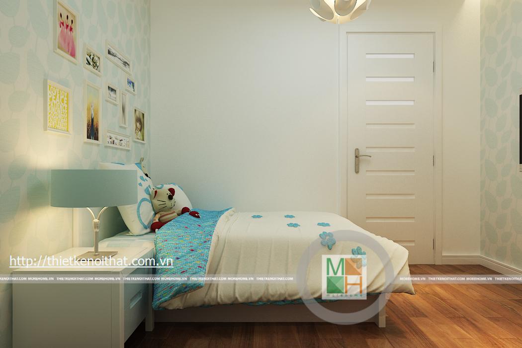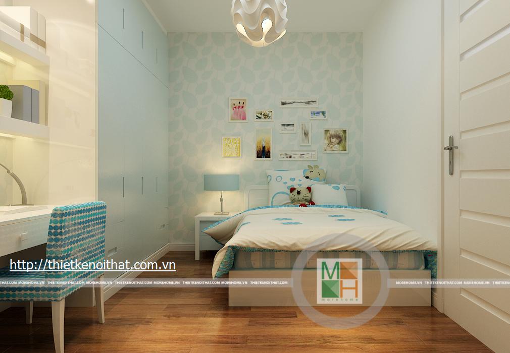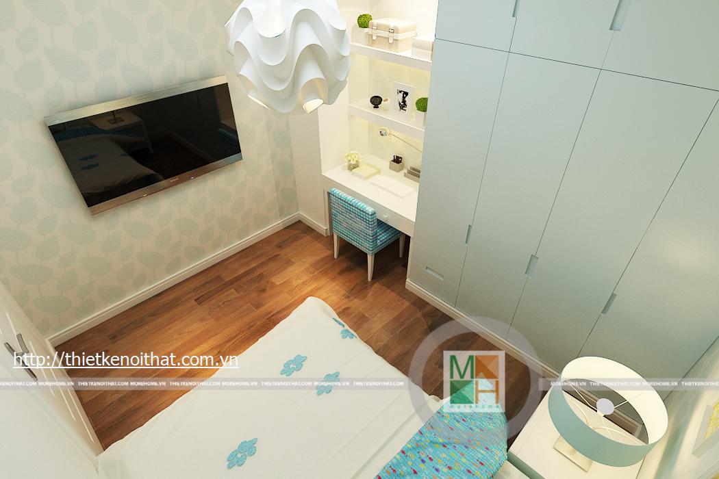 Phòng ngủ con gái mang màu sắc trẻ trung, nữ tính phù hợp với lứa tuổi cũng như giới tính. Mọi đồ dùng, nội thất trong phòng đều được thiết kế tối giản để tạo diện tích cho căn phòng. TV được treo trên tường đối diện giường ngủ, tủ đồ được kê sát tường cùng với một chiếc bàn học nhỏ.