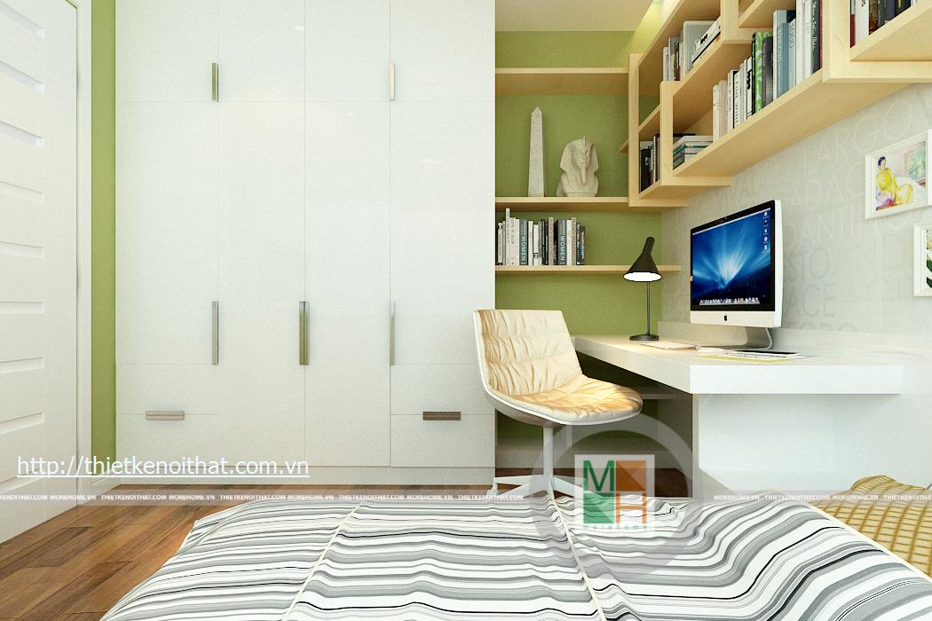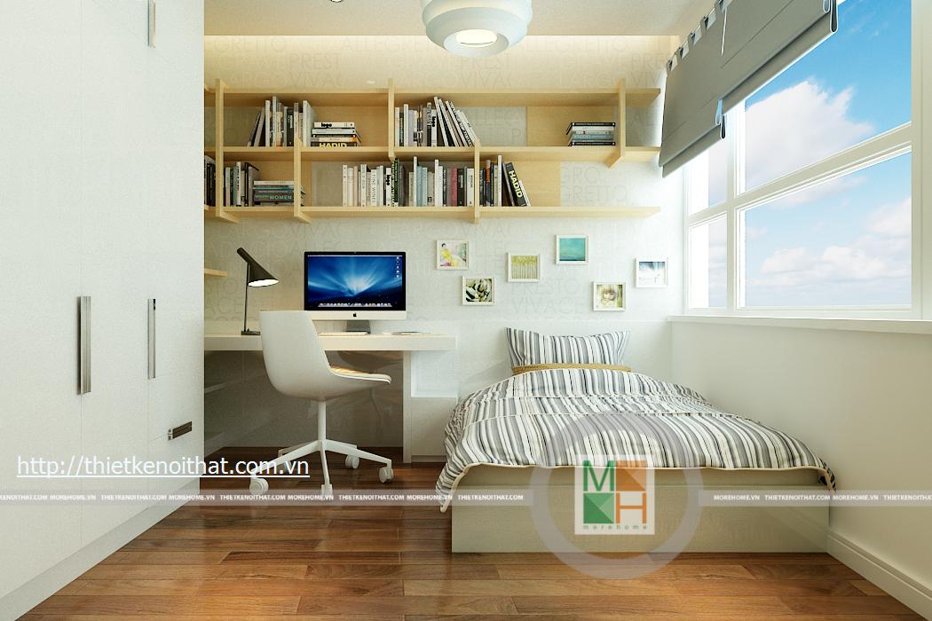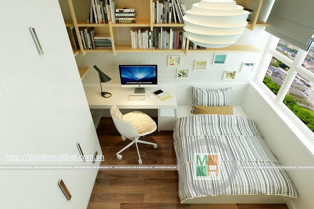 Phòng ngủ con trai có một cửa sổ lớn vì vậy không gian trong phòng vô cùng thoáng đãng và mát mẻ. Cách sắp xếp trang trí phòng mạnh mẽ, phù hợp với tính cách chủ nhân căn phòng. Hai màu sắc chủ đạo của căn phòng chính là màu xanh và màu trắng. Bàn học được kê bên cạnh giường, giá sách được thiết kế đơn giản nhưng khá rộng rãi có thể để được nhiều sách cùng đồ trang trí.