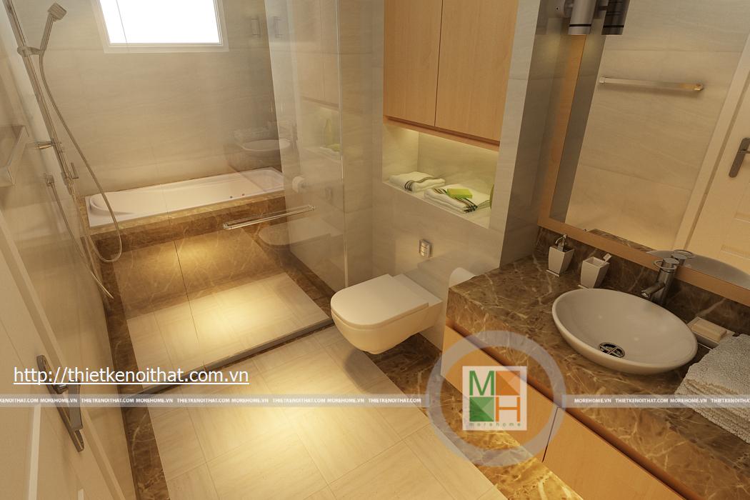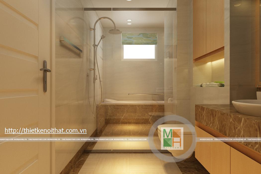 WC chung có một cửa sổ nhỏ tạo không khí thoáng đãng, thoải mái cho không gian phòng tắm. Diện tích phòng không rộng nhưng cách bố trí nội thất bên trong hài hòa vẫn tạo được không gian cho phòng.