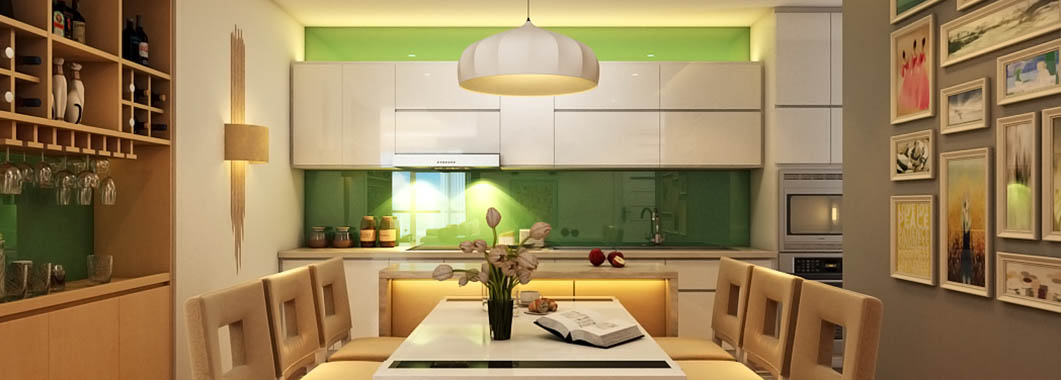 Không gian phòng ăn ấm cúng với sự kết hợp màu sắc hài hòa làm toát lên nét hiện đại vốn có của căn nhà. Bàn ăn được đặt chính giữa phòng với kiểu dáng đơn giản pha chút cá tính mạnh mẽ. Phía bên phải bộ bàn ăn là vách tường được trang trí bởi những bức tranh với bố cục và cách sắp xếp tinh tế. Phía bên trái là một chiếc tủ rượu, thiết kế tiện nghi sang trọng. Khu vực nấu ăn sạch sẽ, thông thoáng nhờ có cửa phía dưới. Điểm nổi bật ở đây chính là bức tường được ốp đá màu xanh ngọc tạo cho không gian phòng ăn thêm mát mẻ. Tủ lạnh, lò nướng và lò vi sóng đều được đặt sát vào tường tạo thêm diện tích cho căn phòng.