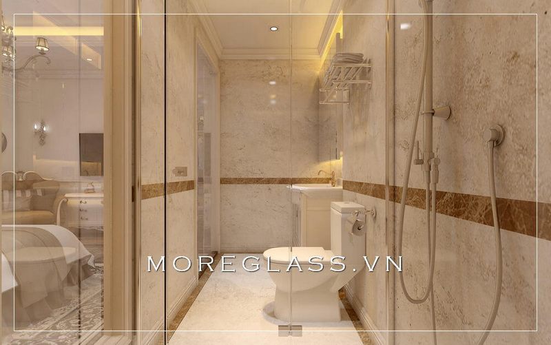 Phòng tắm khách sạn cao cấp được thiết kế với sự sử dụng của cửa kính cường lực suốt, góp phần tạo nên vẻ đẹp tinh tế và sang trọng.