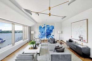Trong phòng khách, ghế sofa được bọc bằng nhung ngọc trai màu xám, trong khi da bò màu xám kem bao gồm các ghế của Vladimir Kagan. Một chiếc bàn pha cocktail có chân bằng đồng cao cổ, làm nổi bật không gian. Thư viện được thiết kế đặc biệt. Một chiếc bàn trượt tuyết ở giữa thế kỷ của Đan Mạch được bố trí vuông góc với cửa sổ để giữ cho khung nhìn có thể tiếp cận được nhưng không bị phân tâm.