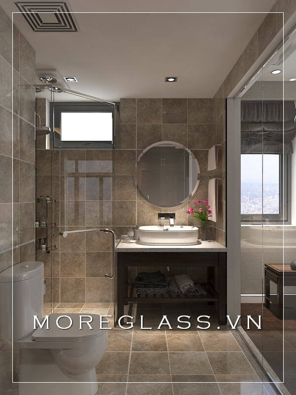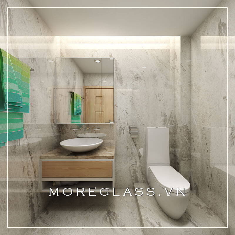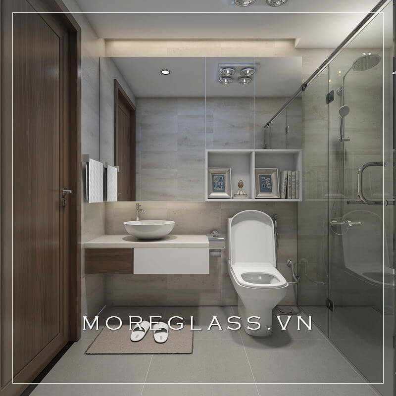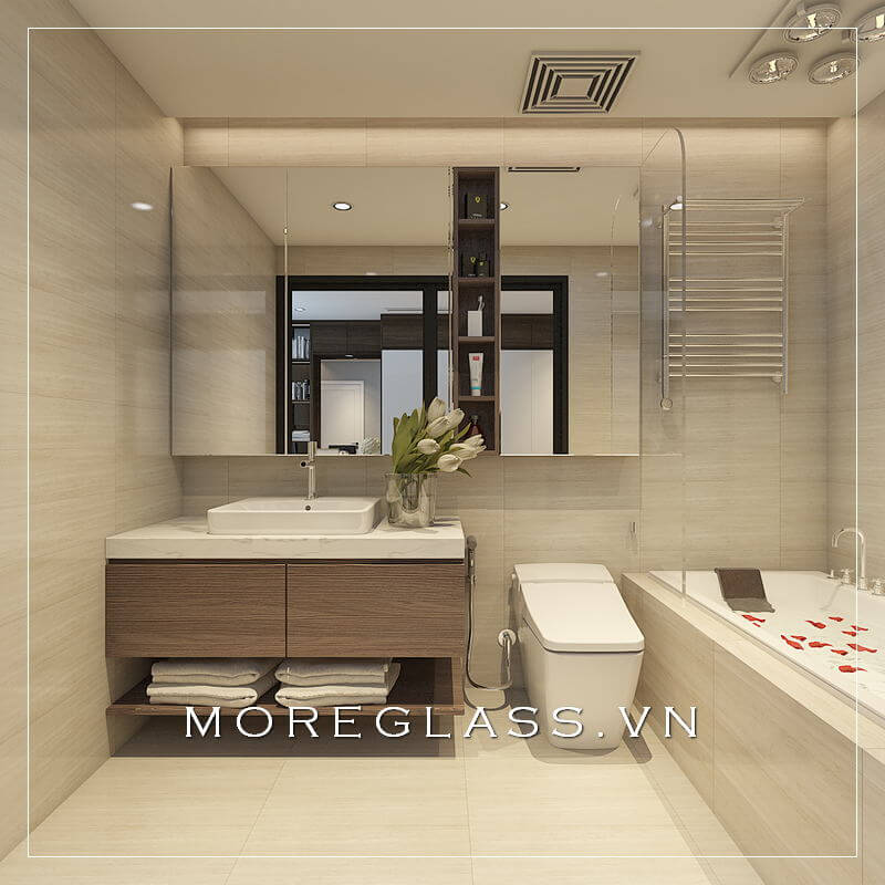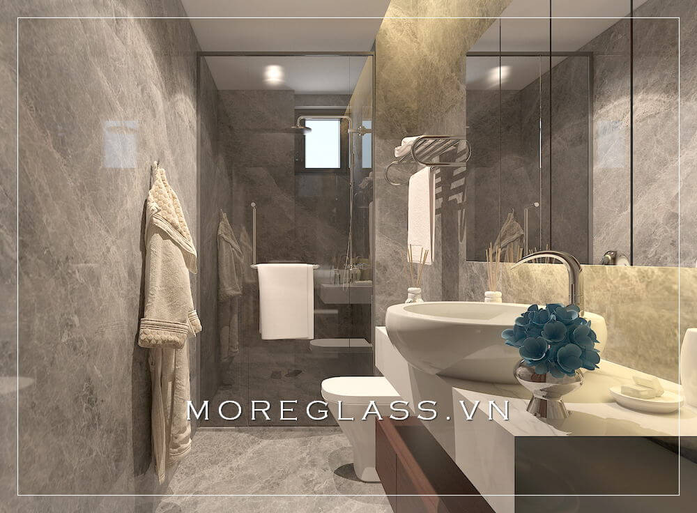 Thiết kế phòng tắm chung cư hiện đại, nhẹ nhàng với nội thất từ kính, đá, gương treo giúp không gian rộng thoáng hơn.