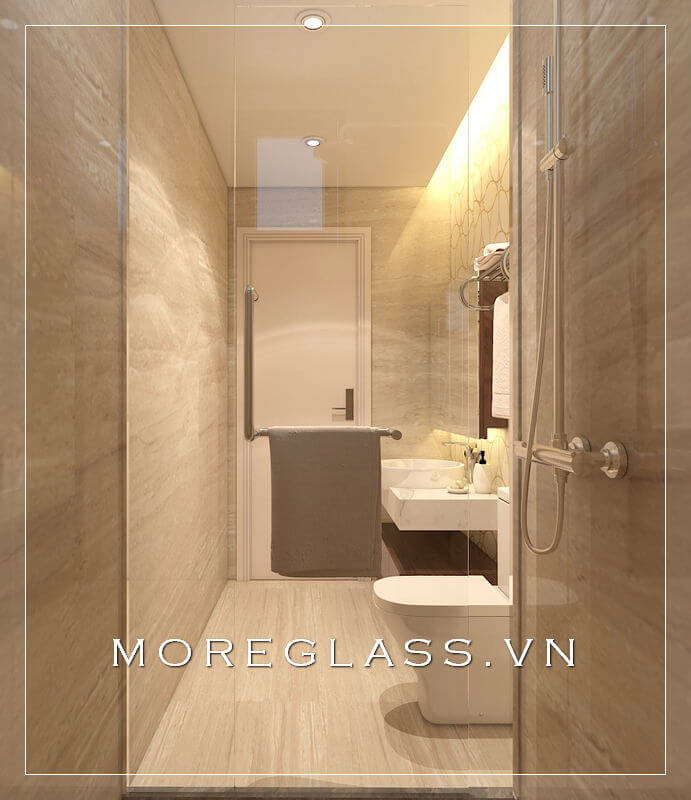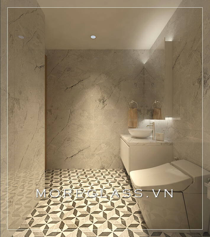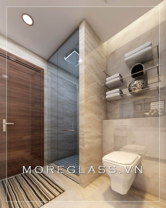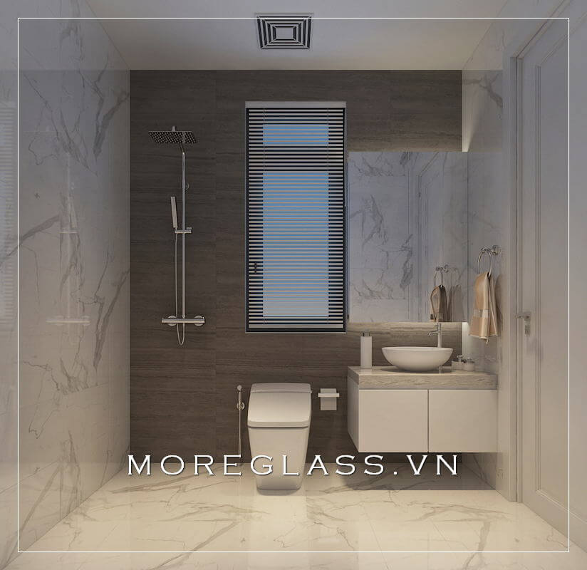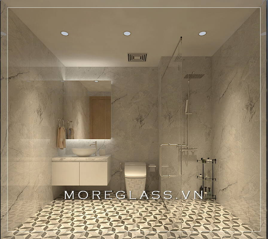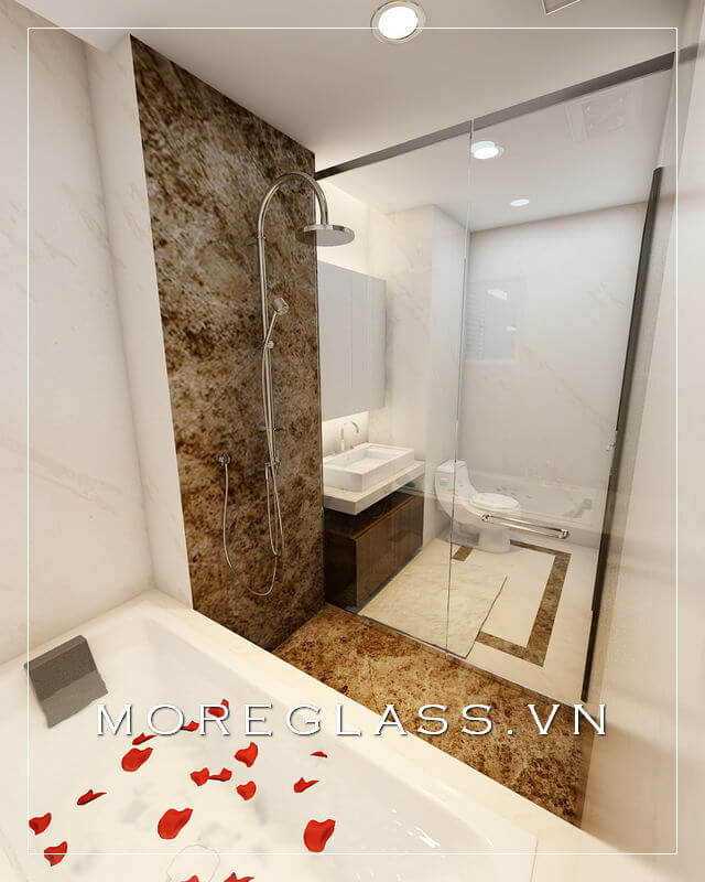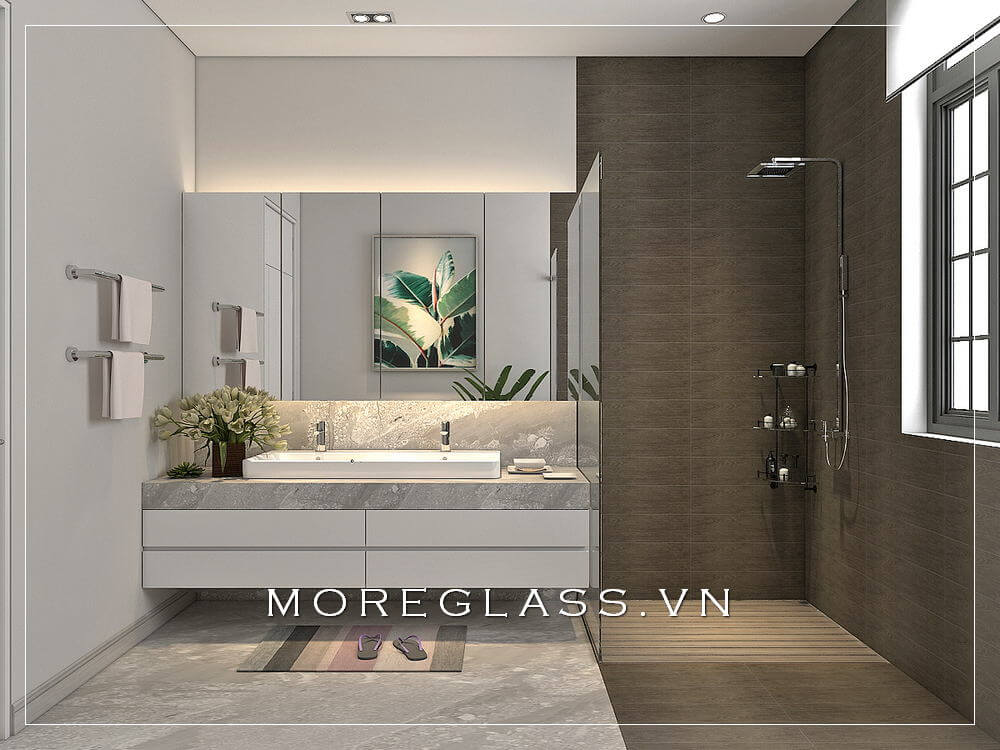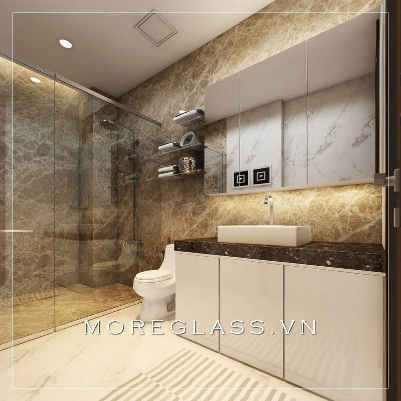 Thiết kế nội thất phòng tắm hiện đại với vật liệu kính, đá ch không gian phòng rộng và thoáng hơn